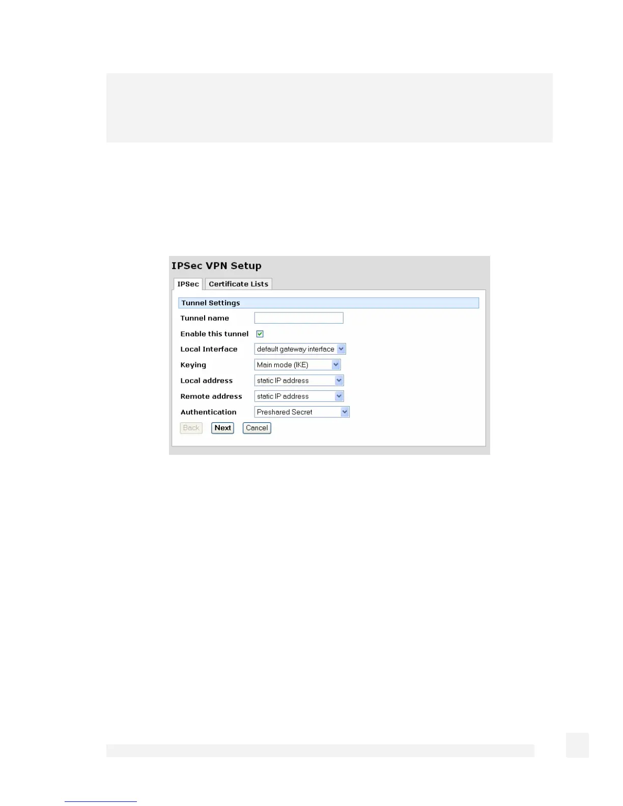 To create an IPSec tunnel, click the IPSec link on the left side of the web management