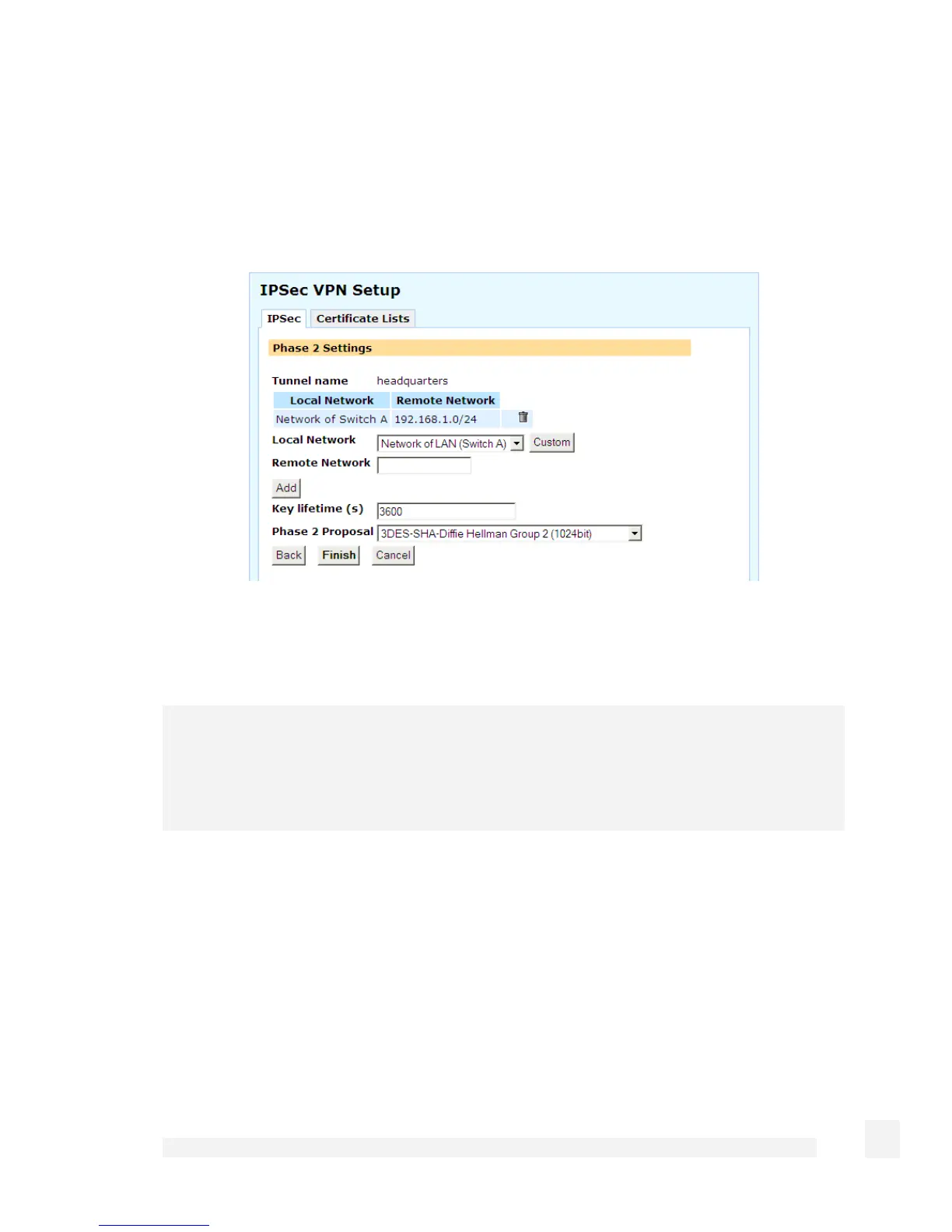 Set the length of time before Phase 2 is renegotiated in the Key lifetime (s) field. The