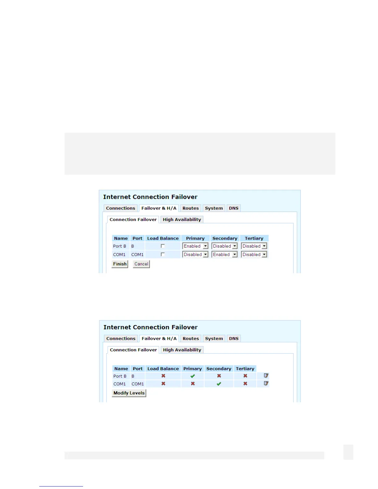 On the Network Setup page, click the Failover & H/A tab, then Modify Levels. A table
