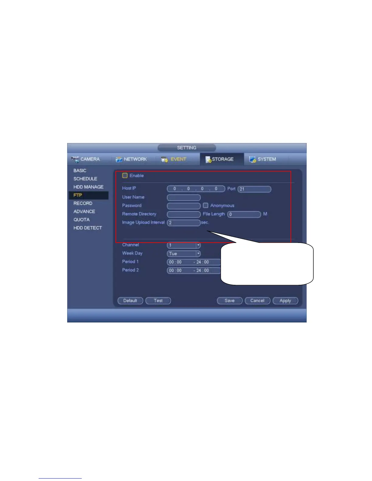 In the main menu, from Setting->Storage->FTP, you can set FTP server information.