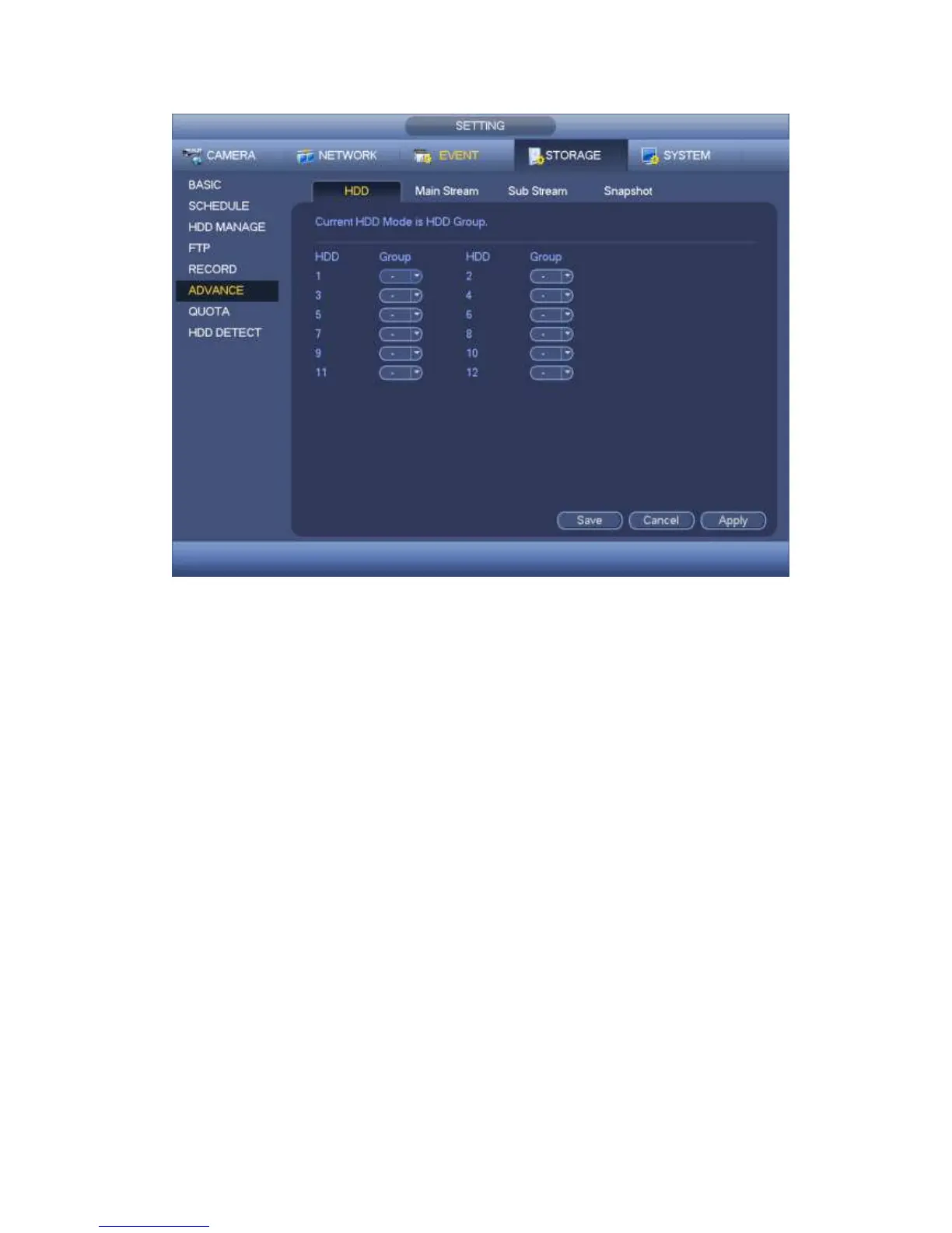 Step 4 Click main stream/sub stream/snapshot button to set corresponding HDD group