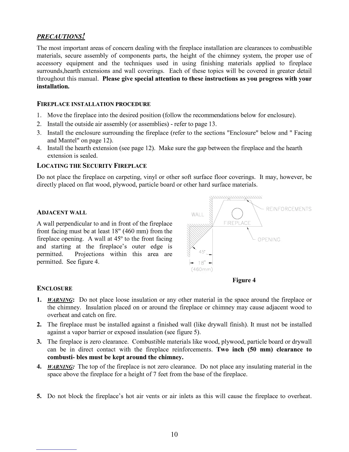 Security Fireplace SECURE HE43-1 - Precautions!; Fireplace Installation Procedure; Locating the Security Fireplace; Adjacent Wall