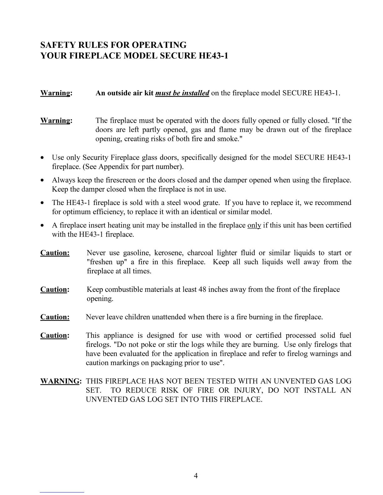 Security Fireplace SECURE HE43-1 - Safety Rules for Operating Your Fireplace