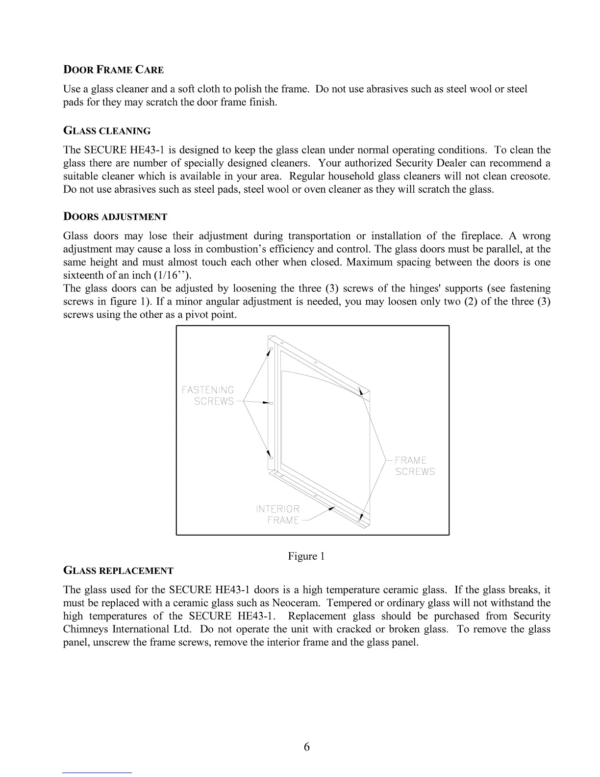 Security Fireplace SECURE HE43-1 - Door Frame Care; Glass Cleaning; Doors Adjustment; Glass Replacement