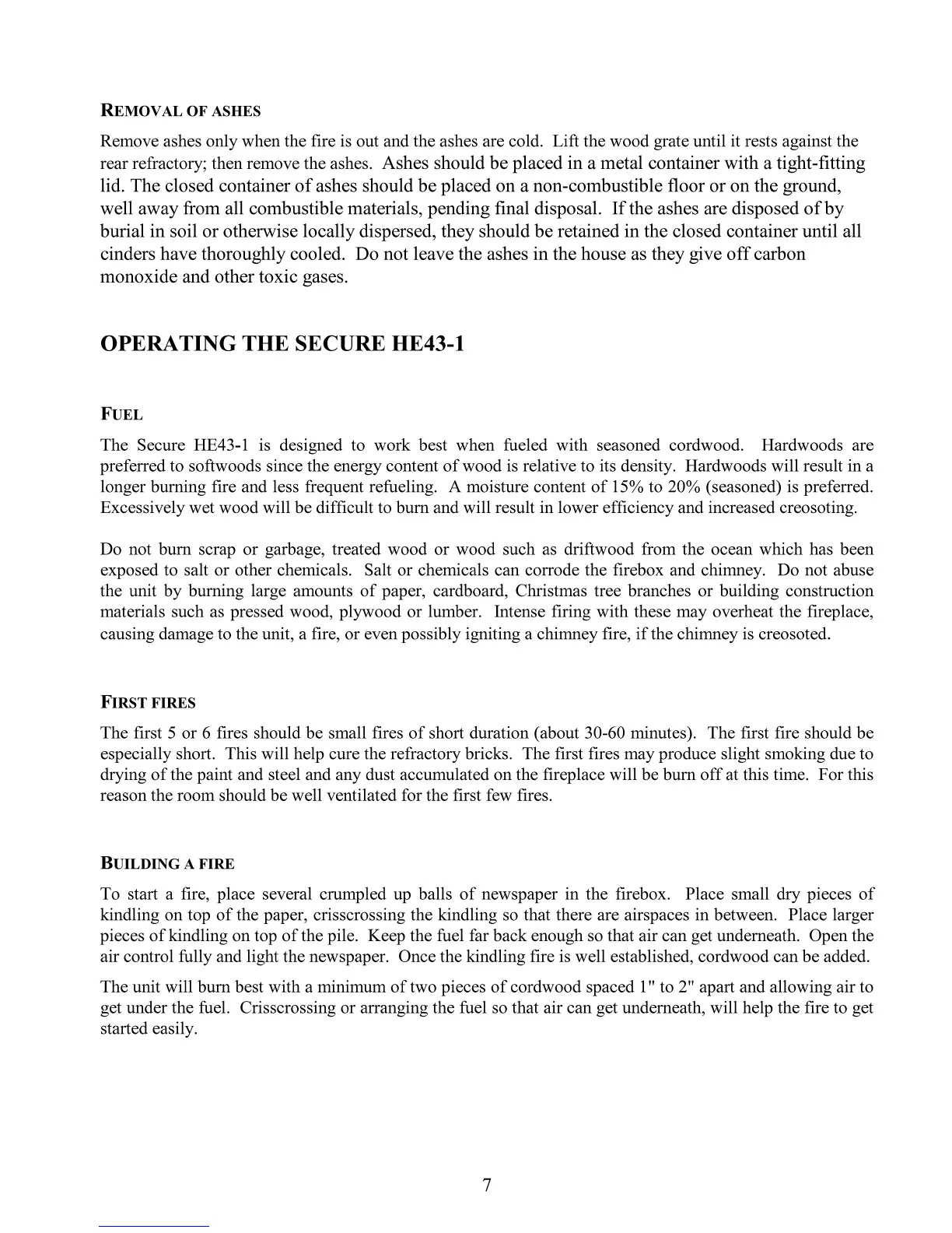Security Fireplace SECURE HE43-1 - Operating the SECURE HE43-1; Fuel; First Fires; Building a Fire