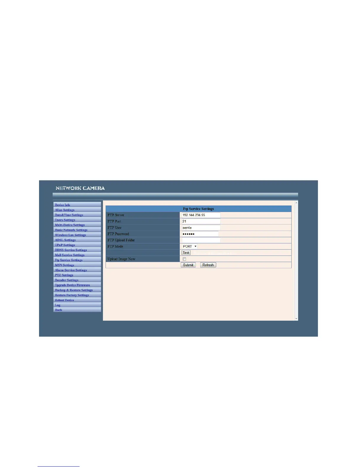 FTP Test - Set the FTP parameters and then click 'Submit' before testing the