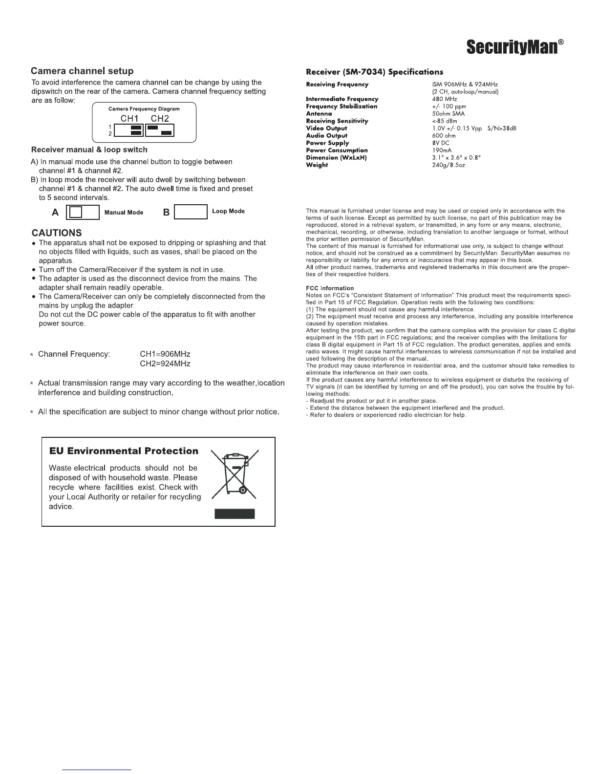 SecurityMan SM-7034 - Camera Channel Setup; Channel Selection Methods; Receiver Specifications; Technical Details