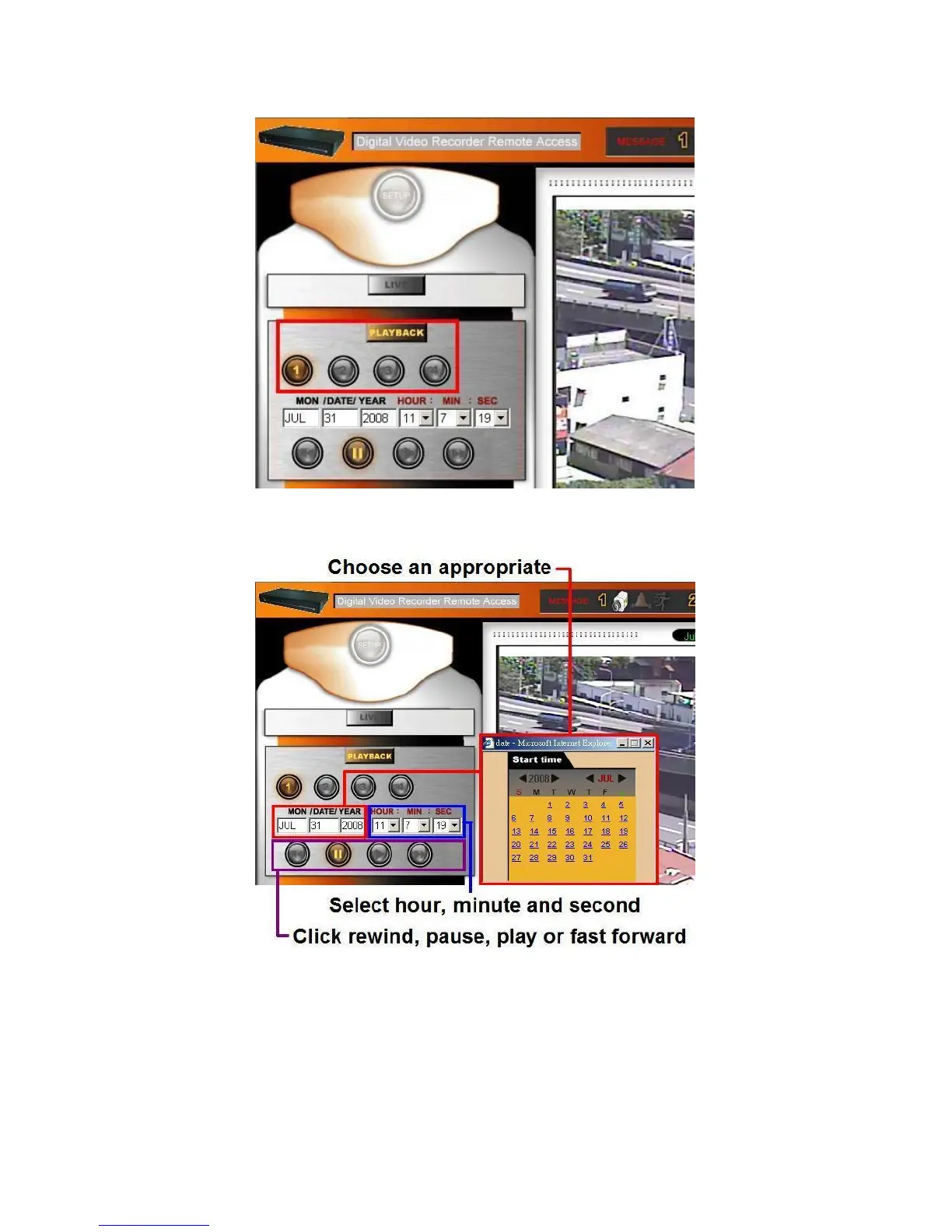 Search an appropriate date & time, and click rewind, pause/play or fast forward to view