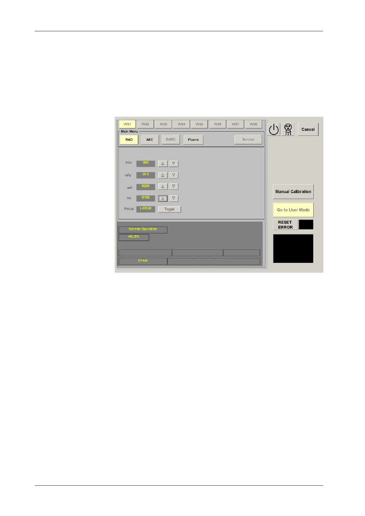 6. Select: RAD Menu, 80 kV, 200 mA, 100 ms and Large Focus. Make an