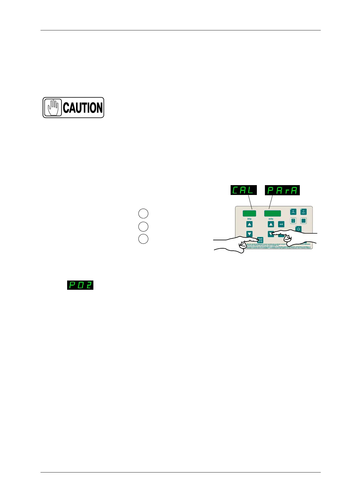 2. Select menu P02 by pressing the “kVp Increase” push-button (kVp