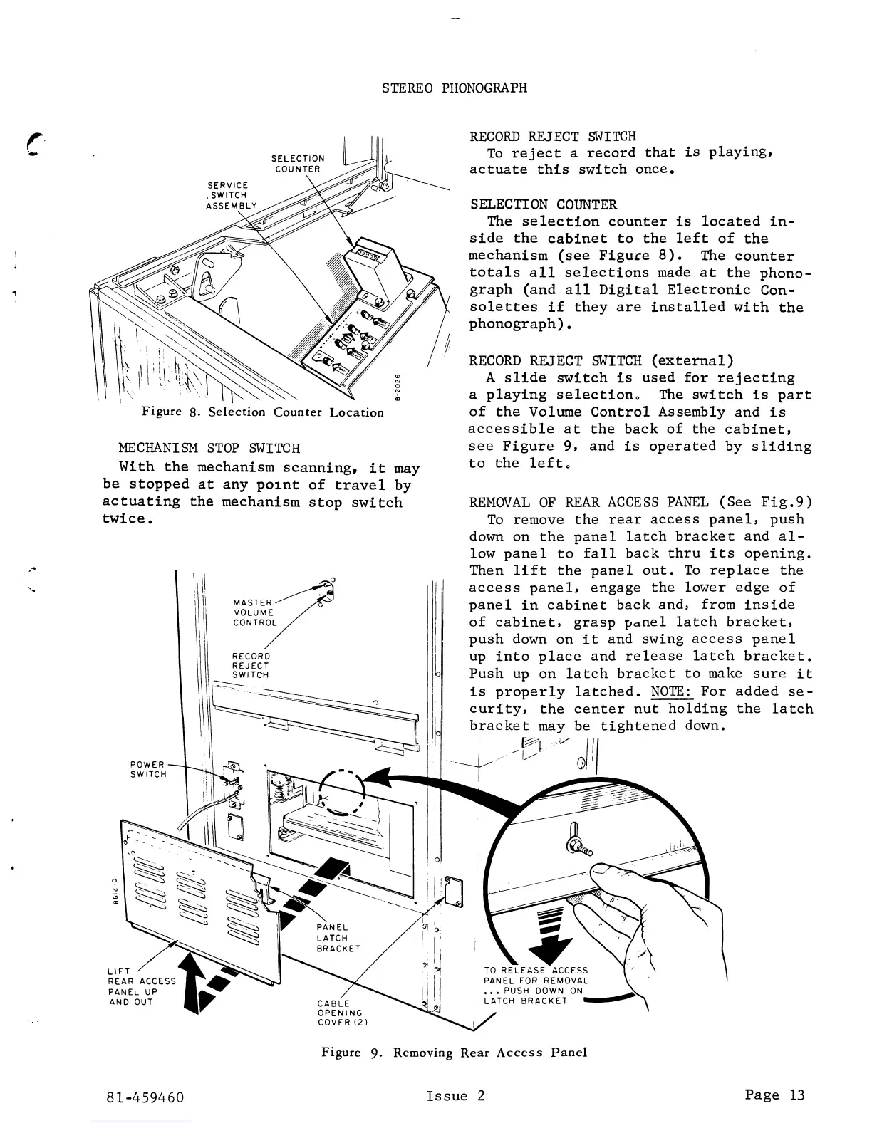 Seeburg STD4 - Mechanism Stop Switch; Record Reject Switch; Selection Counter; Removal of Rear Access Panel