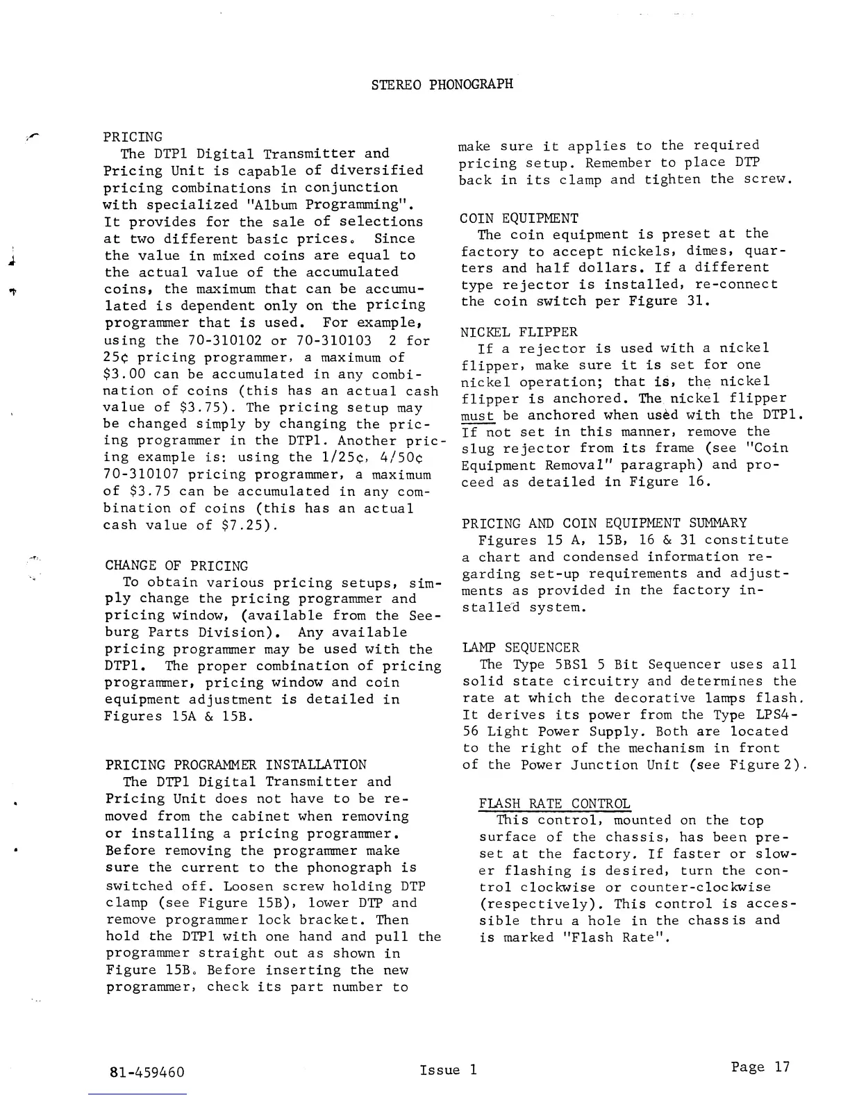 Seeburg STD4 - Stereo Phonograph Pricing; Changing Pricing Setups; Pricing Programmer Installation