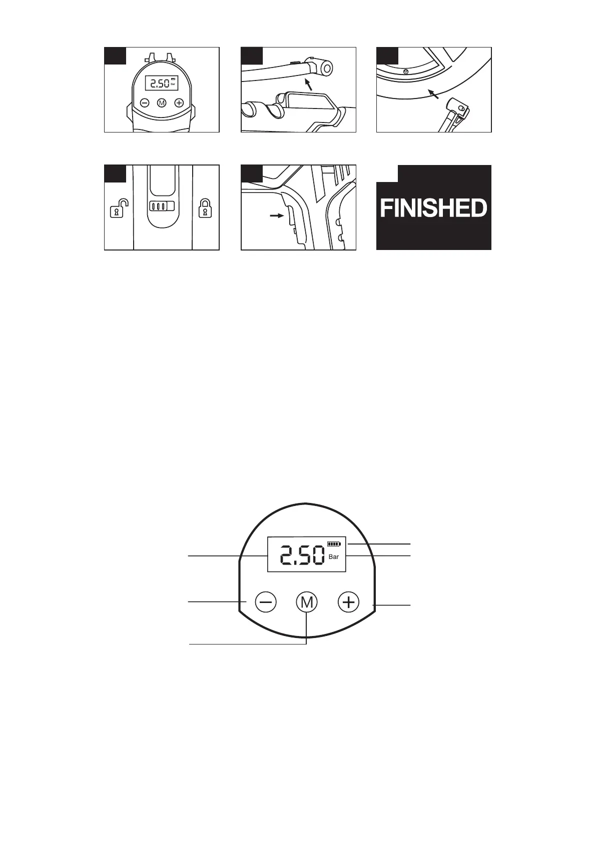 Appuyez sur `M` pour sélectionner l‘unité. Appuyez sur `+` ou `-` pour prérégler la pression. Attendez quelques secondes jusqu‘à ce que l‘afchage