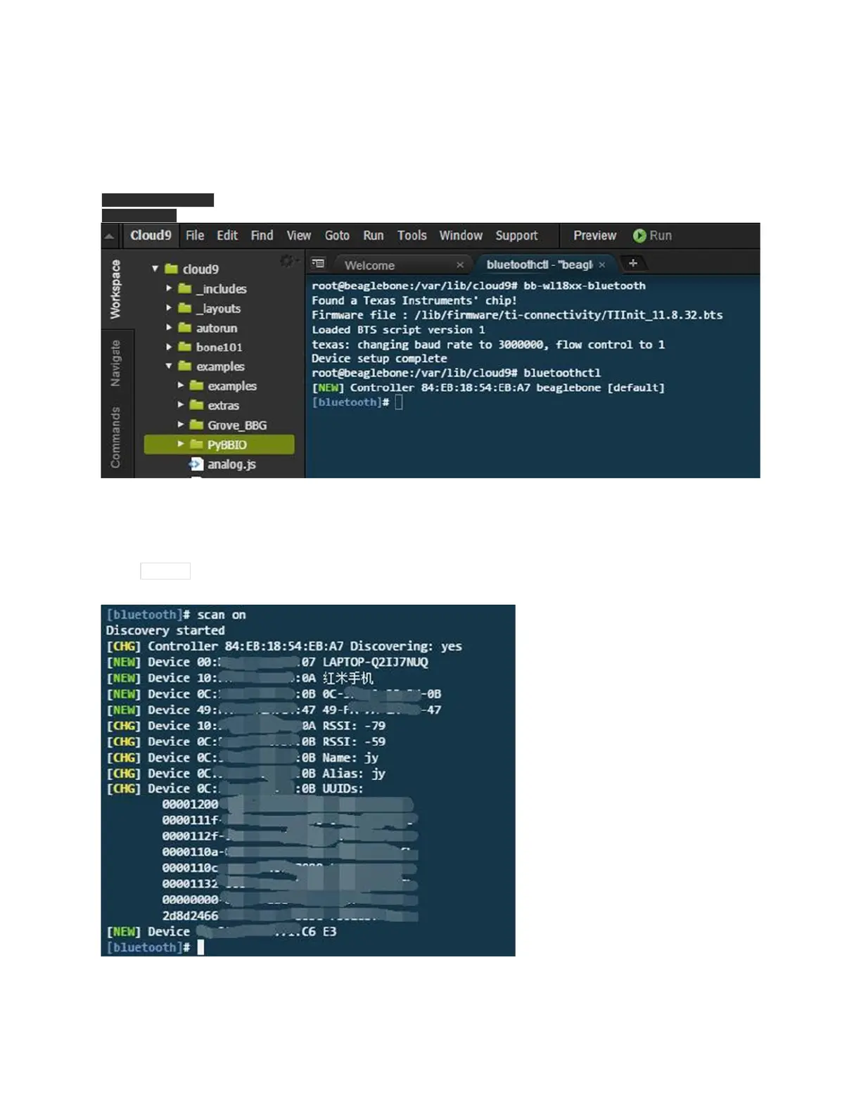 Connect to Cloud9 IDE and start a new terminal. Start the bluetooth config with the command: