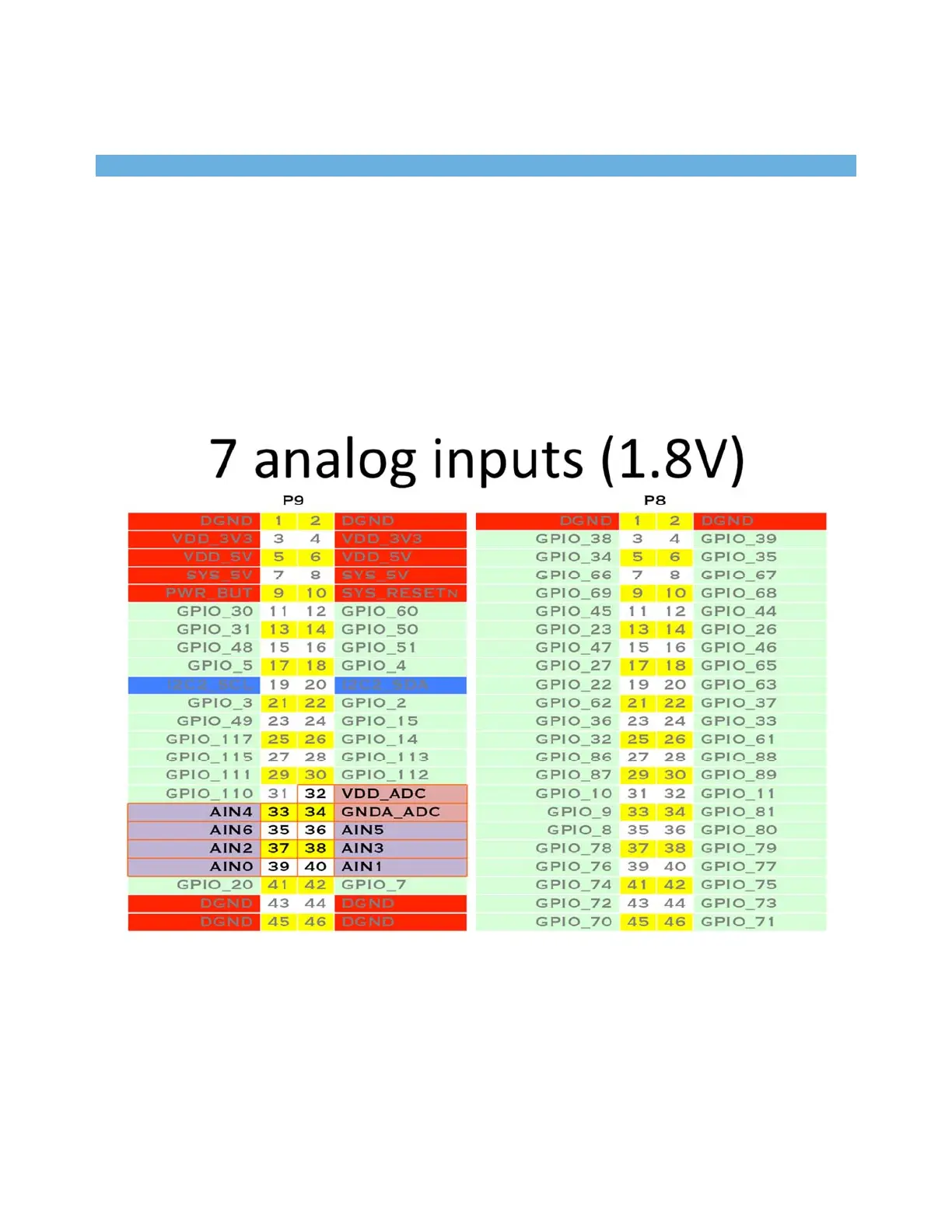 analog-to-digital converter with 8 channels, 7 of which are made available on the headers.