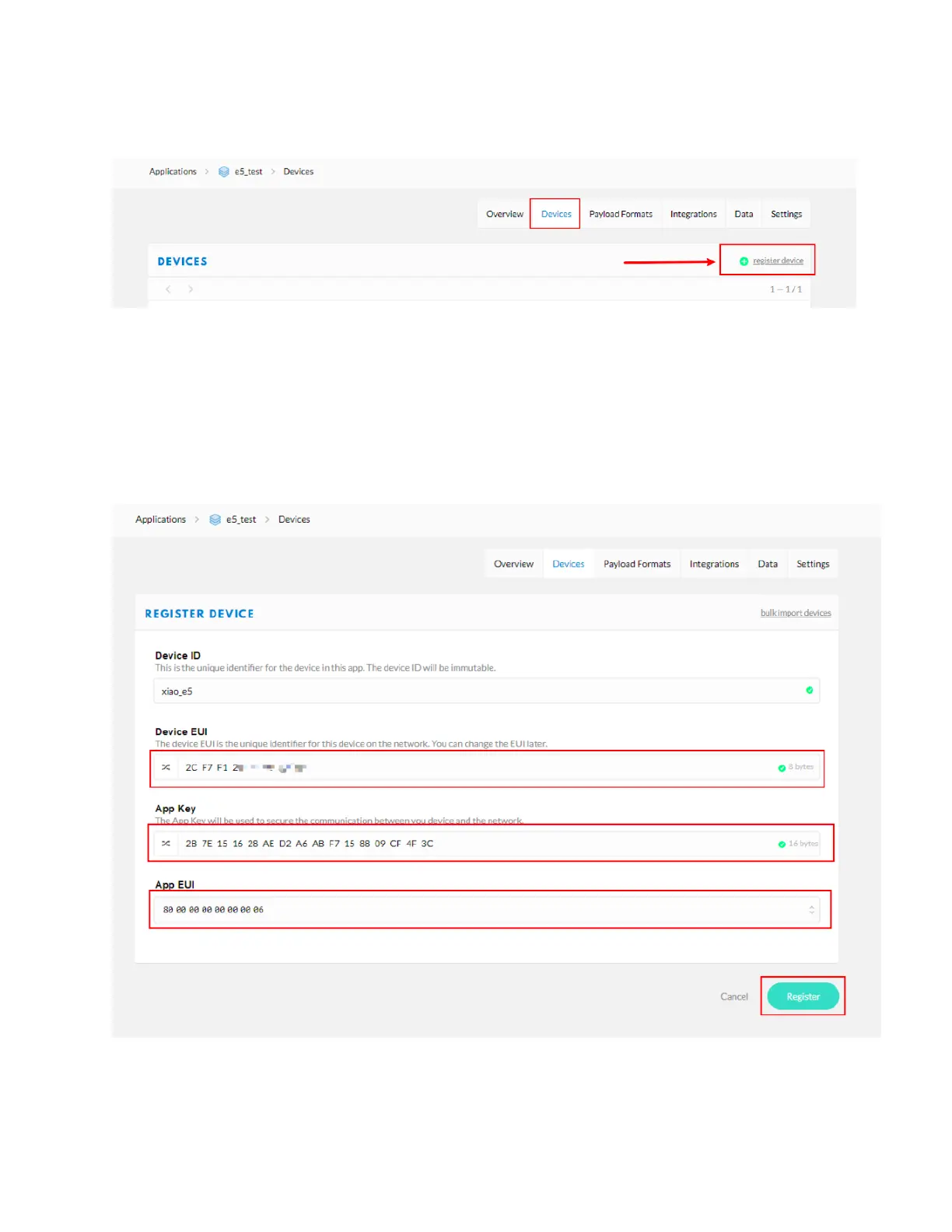 2. Device EUI: Select the E5 dev EUI.
