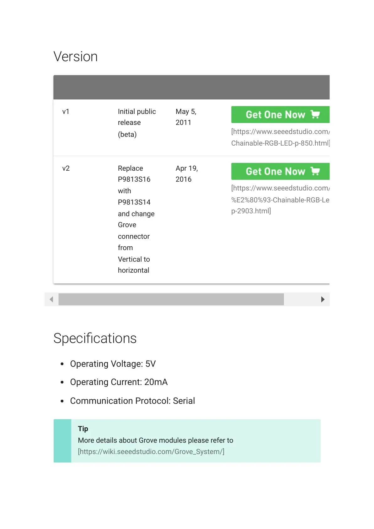 Seeed Grove - Grove LED Versions and Specifications; Key Specifications