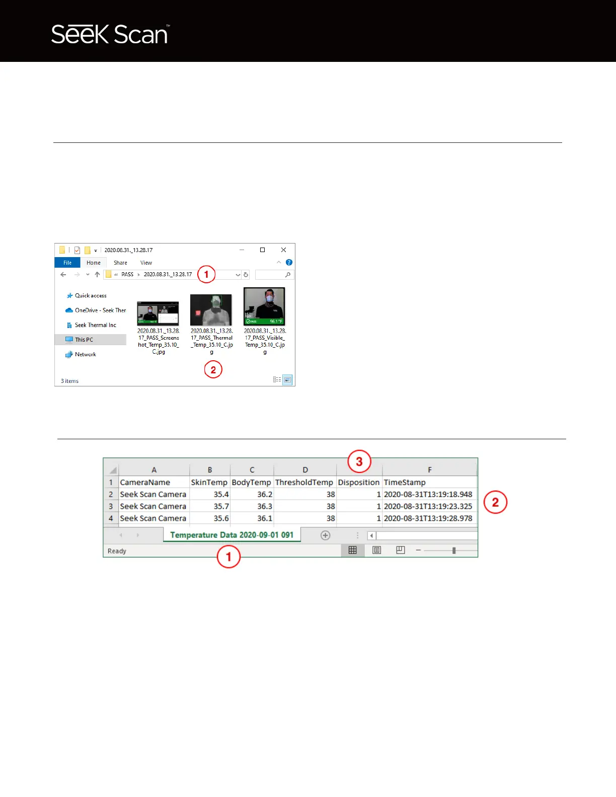 body temperature, customizable threshold temperature, ‘PASS’ or ‘FAIL’ disposition, and time of