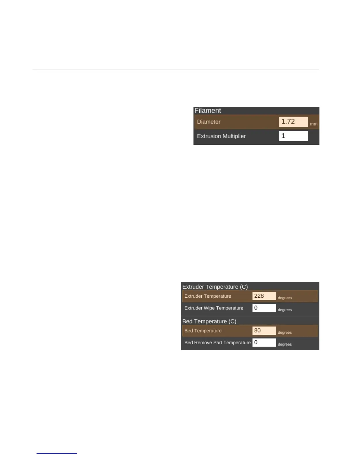 printing with. The Filament page is divided into three categories; Filament, Temperature, and