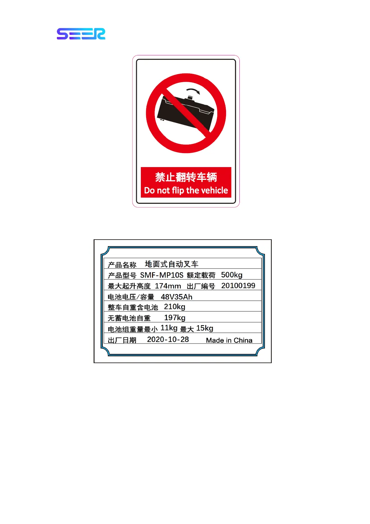 SEER SFL-MP10S - Nameplate