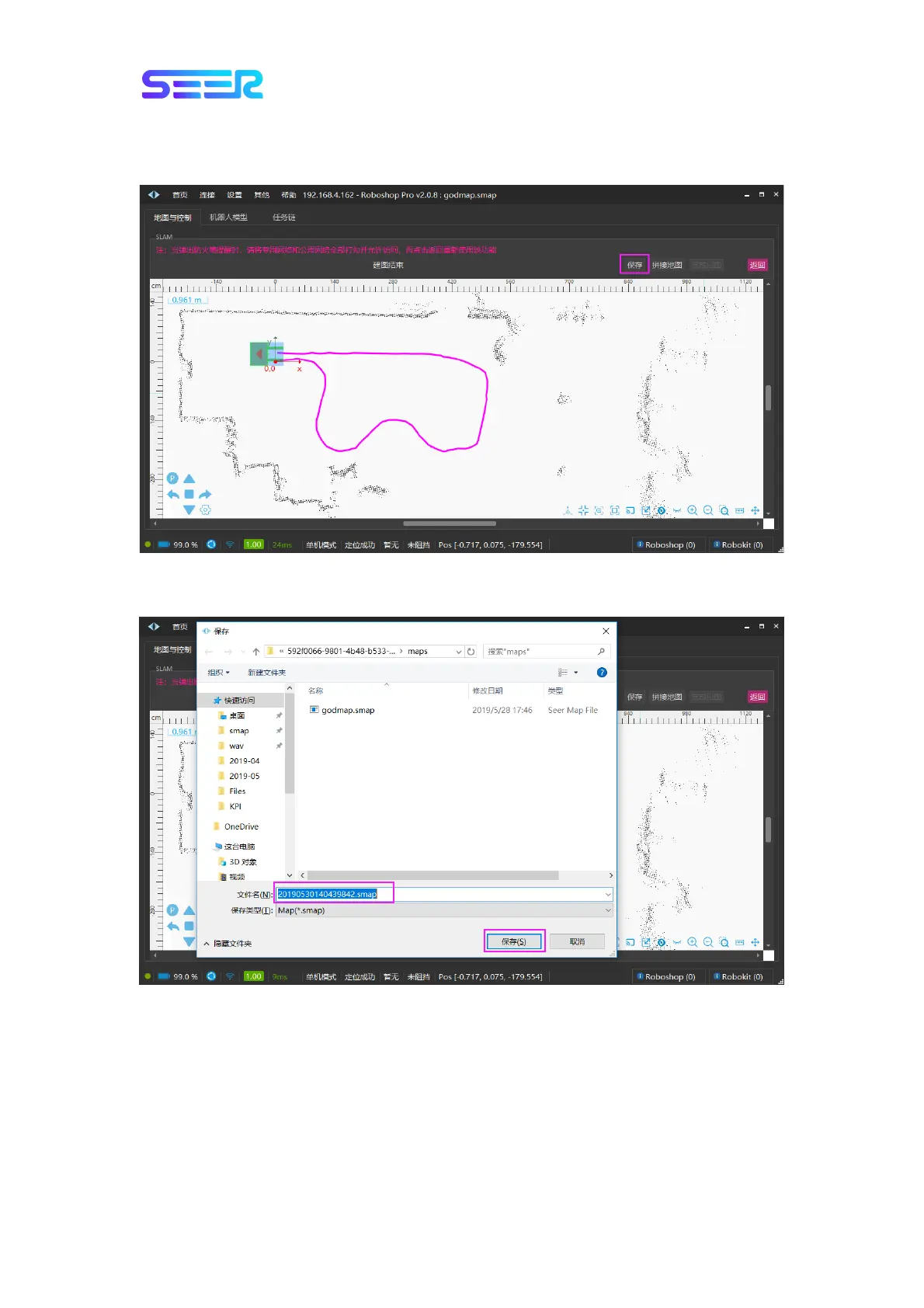 d. Wait for the completion of the map building, and then click the [Save] button in the upper