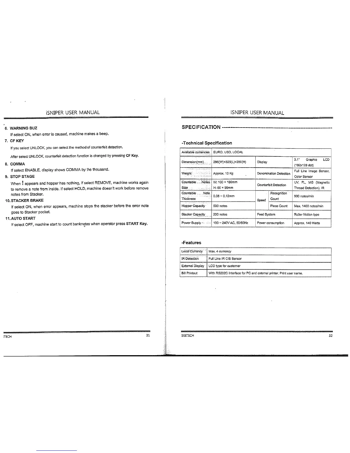 SeeTech iSniper - Advanced User Mode Settings; Specifications Overview; Technical Specifications; Product Features