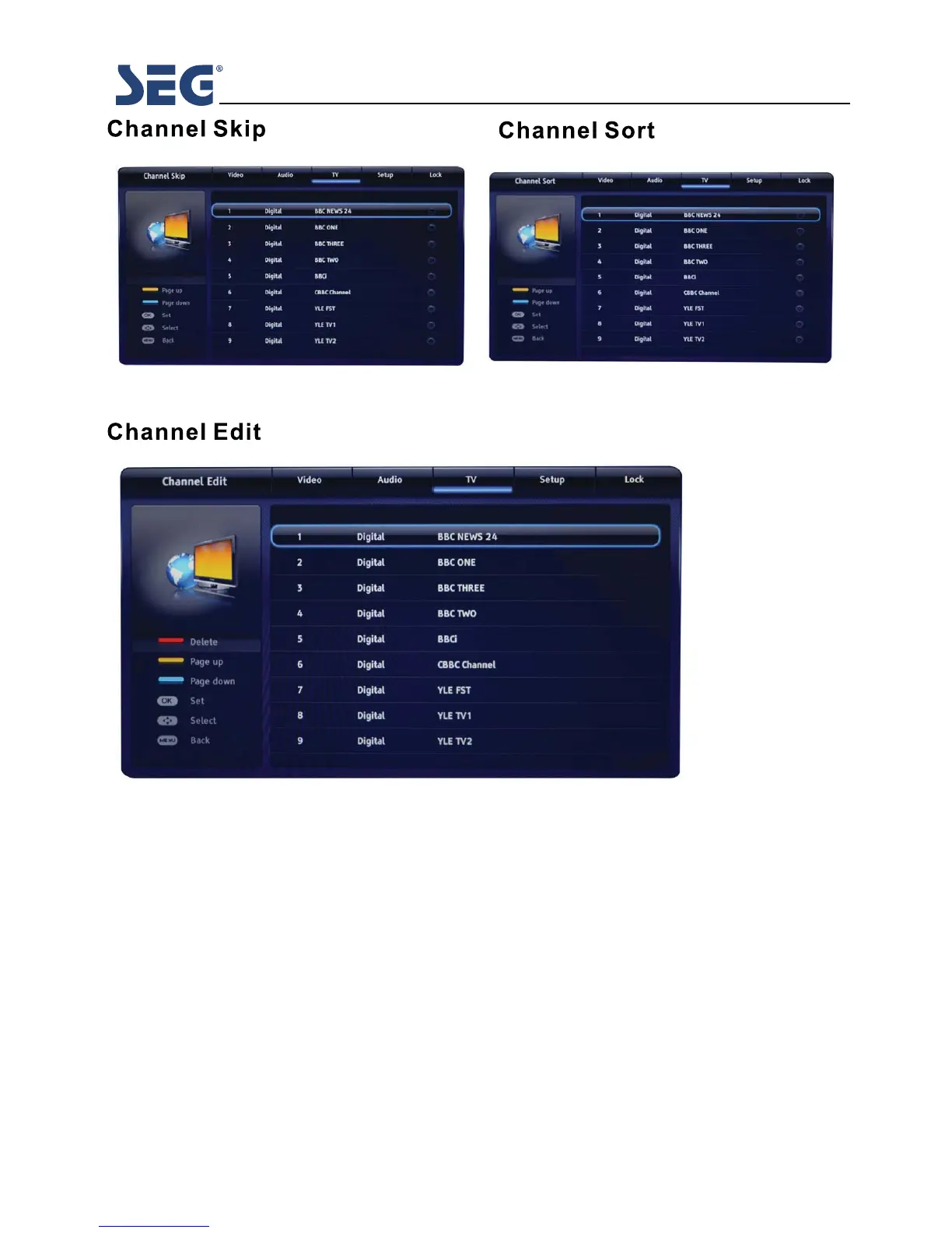 All available TV receiver sources can be set one after the other. Switching between the single