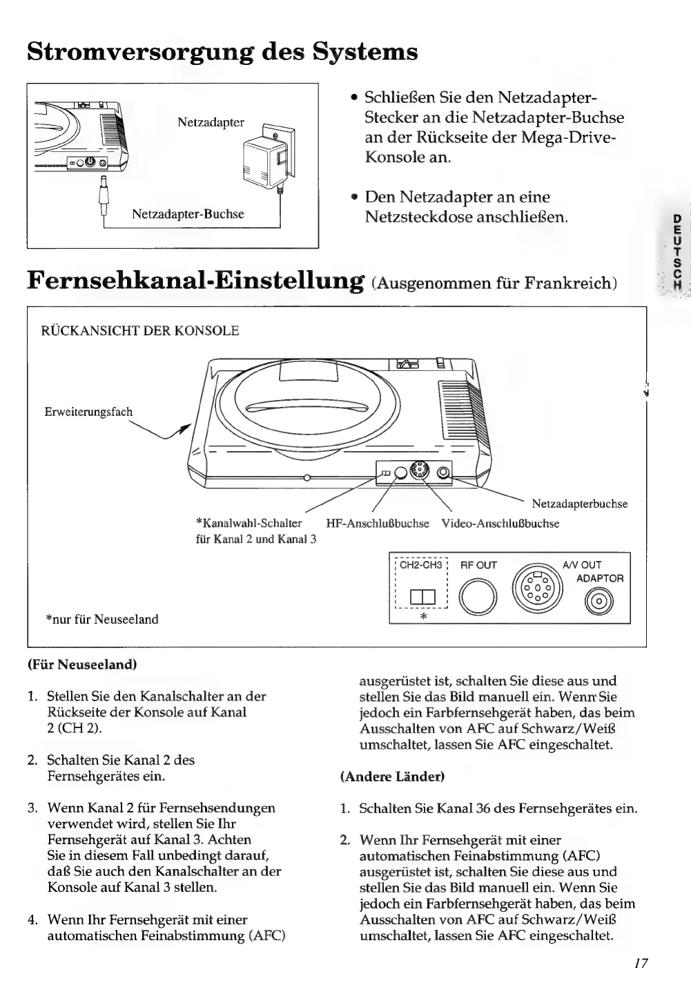 Sega Mega Drive - Stromversorgung des Systems; Fernsehkanal-Einstellung