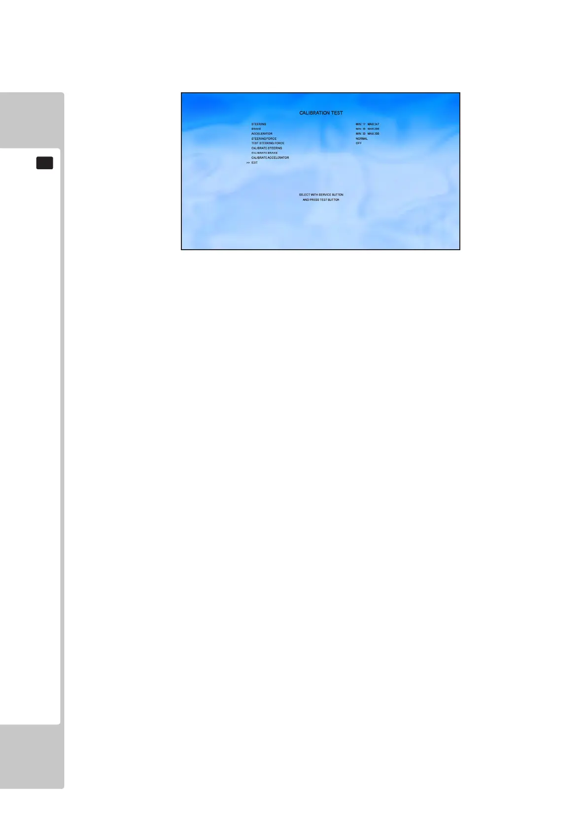 TEST STEERING FORCE: FULL LEFT: Current steering feedback strength applied LEFT.
