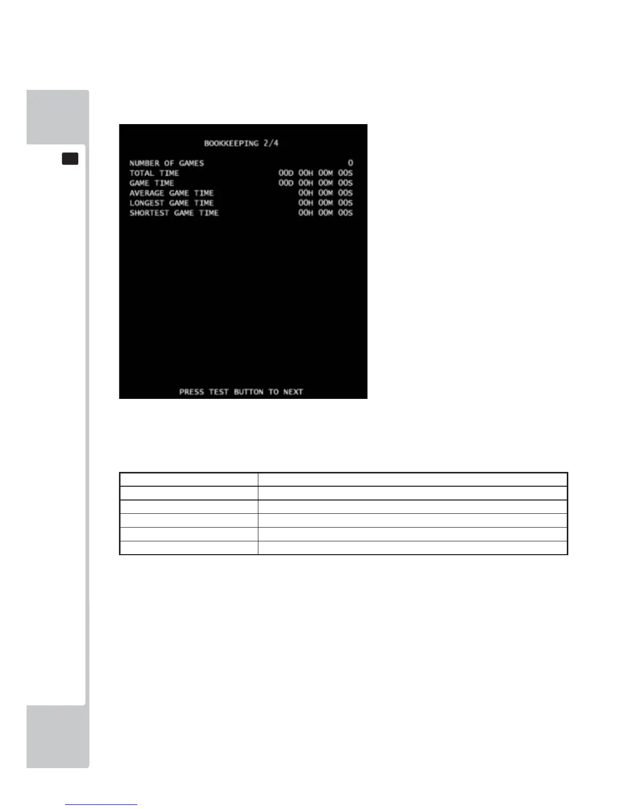 - Press the TEST Button to move to BOOKKEEPING 2/4 screen.