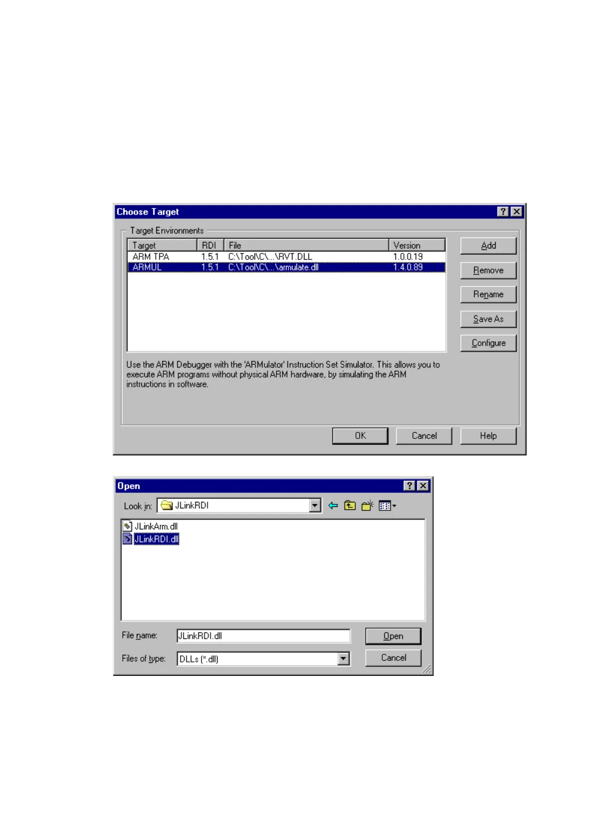 The JLinkRDI.dll has been tested with ARM’s AXD version 1.2.0 and 1.2.1.