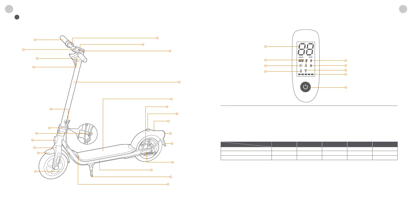 Power Button: Press the button to turn on; press and hold the button for 3 seconds to turn off. When the KickScooter is on, press the button