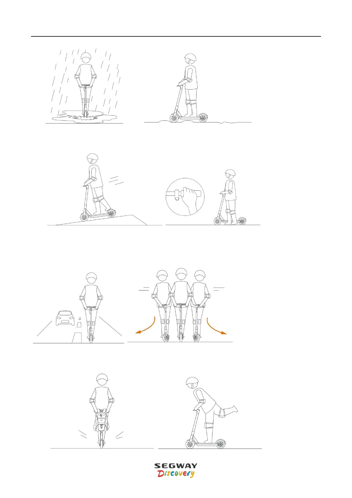 7) Do not carry heavy objects on the handle bar; do not ride the kick scooter with one foot.