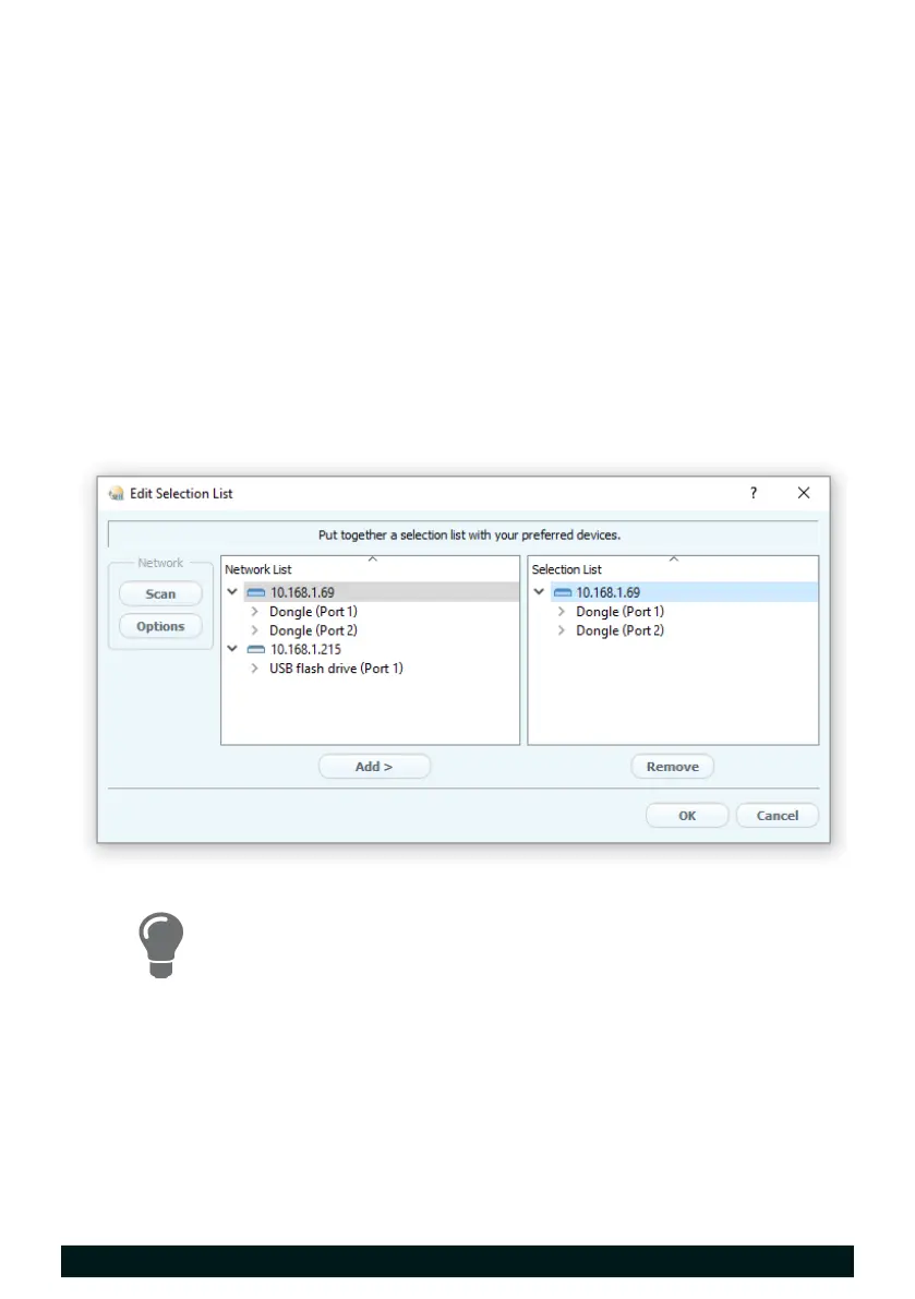 The UTN servers and the connected USB devices or USB dongles are dis-