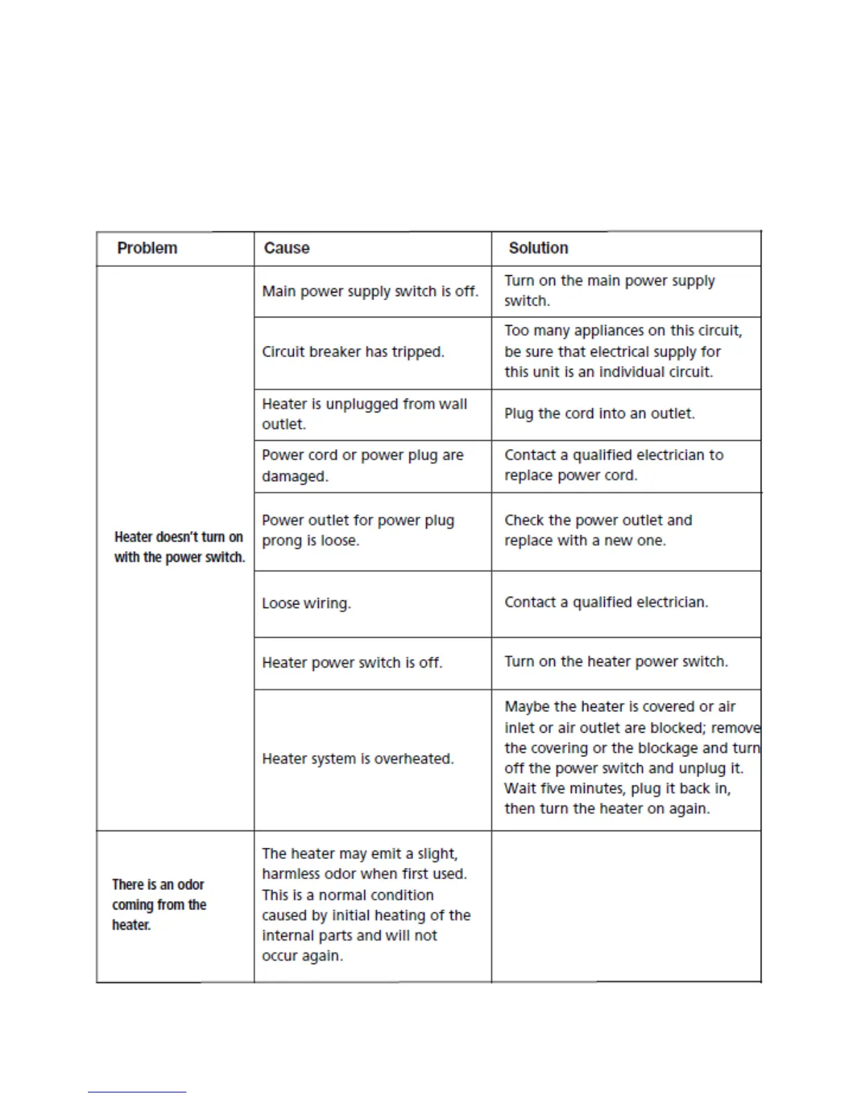 SEI FA515500 - Troubleshooting Common Issues; Heater Fails to Turn On; Initial Odor Explanation