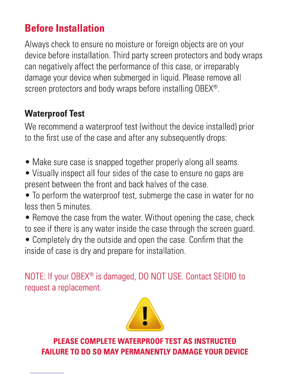 Seidio OBEX - Before Case Installation; Waterproof Test Procedure