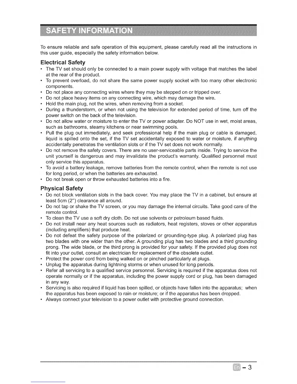 . The TV set should only be connected to a main power supply with voltage that matches the label