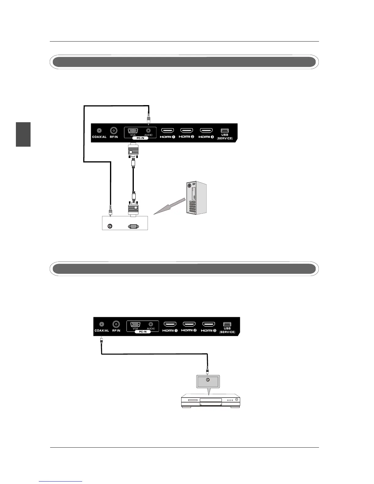 Connectez la sortie RGB du PC à la prise VGA (PC) sur le téléviseur. Reliez la sortie audio de