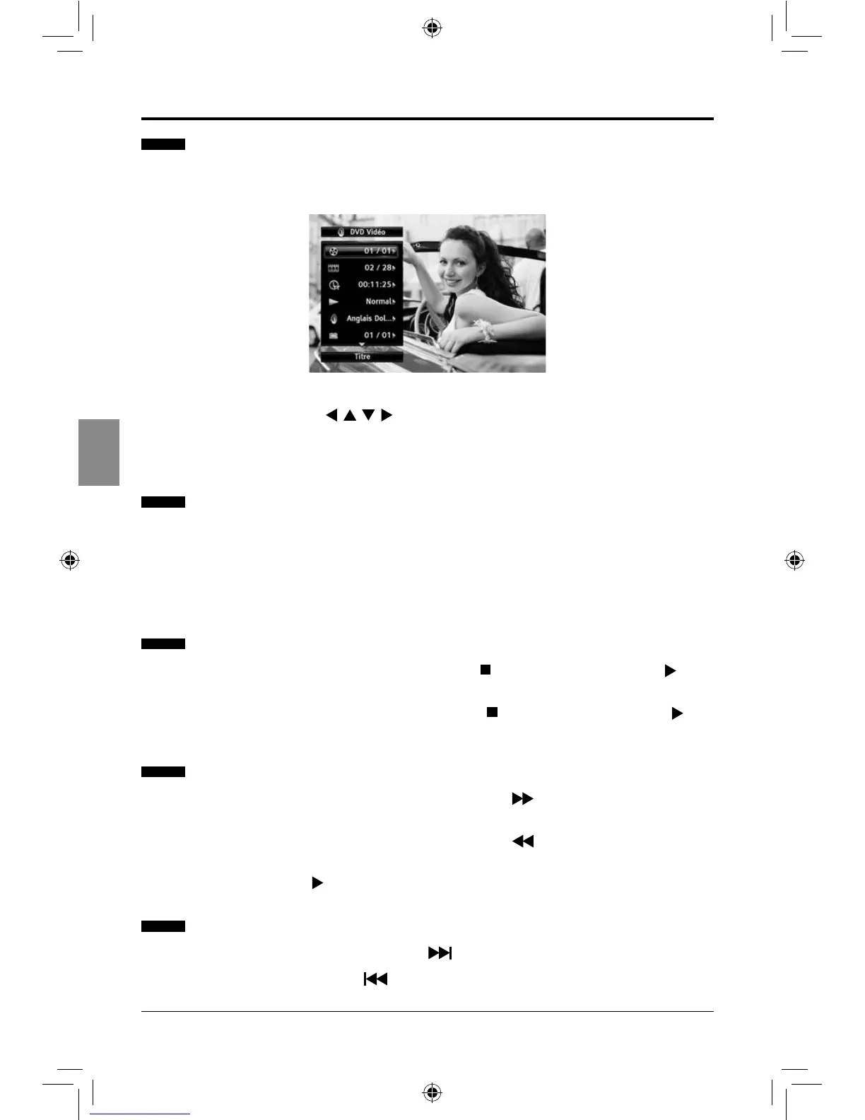 à l'écran, par exemple, sélectionner le titre, le chapitre, la langue audio, etc. que vous