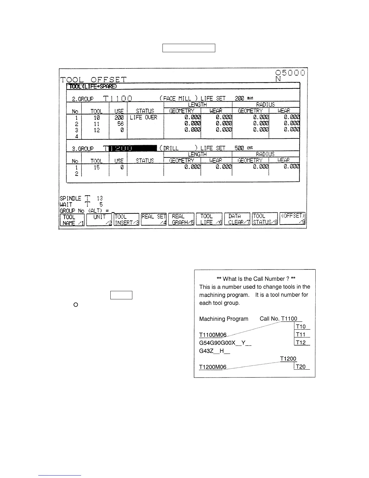 In the screen shown in Fig. 1, press F6/SPARE TOOL . The SPARE TOOL screen in Fig. 2
