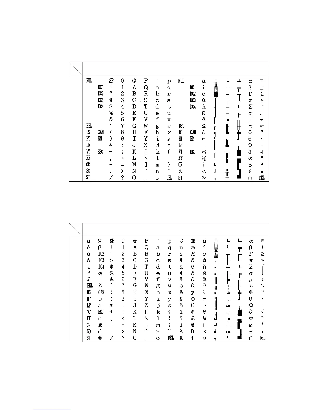 Note: This character set is selected with ESC t 1 in FX mode. Refer to Control code summary section.