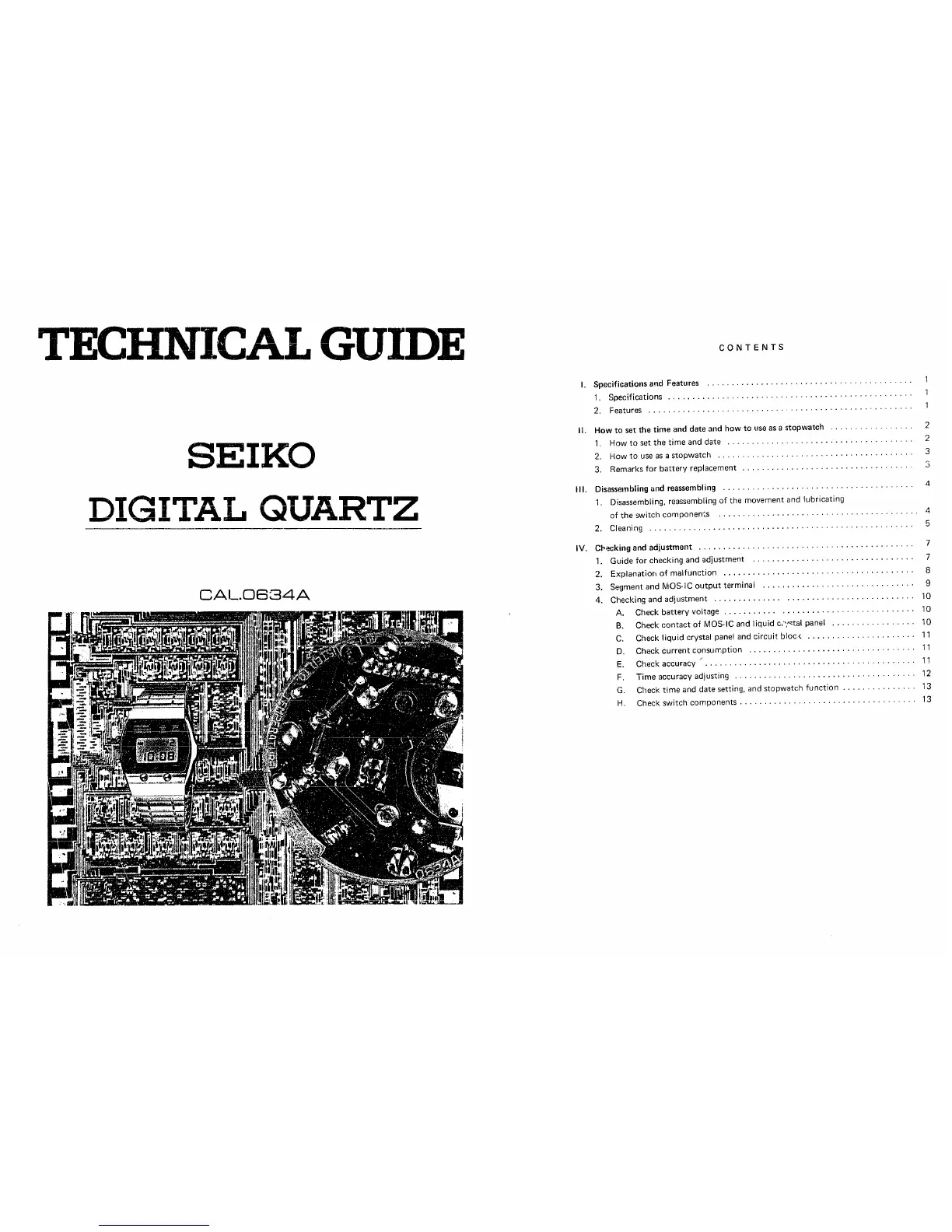 Seiko 0634A - SEIKO 0634 A Specifications and Features; SEIKO 0634 A Setting Time, Date, and Stopwatch Use; SEIKO 0634 A Disassembly, Reassembly, and Cleaning; SEIKO 0634 A Checking and Adjustment Procedures