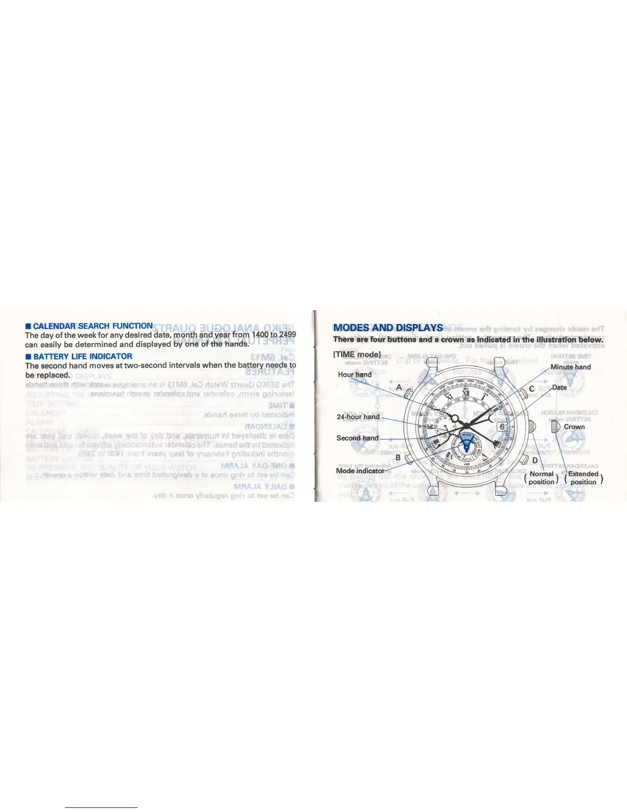 Seiko 6M13 - Calendar Search and Modes; Calendar Search Functionality; Modes and Display Elements