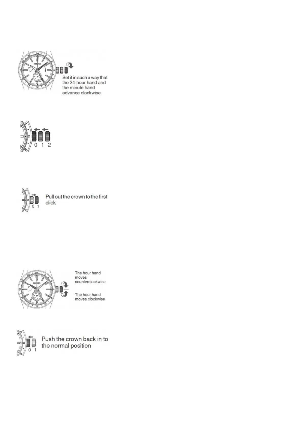 4 Push the crown back in to the normal position. Thereby, the 24-hour hand, the minute hand and the seconds