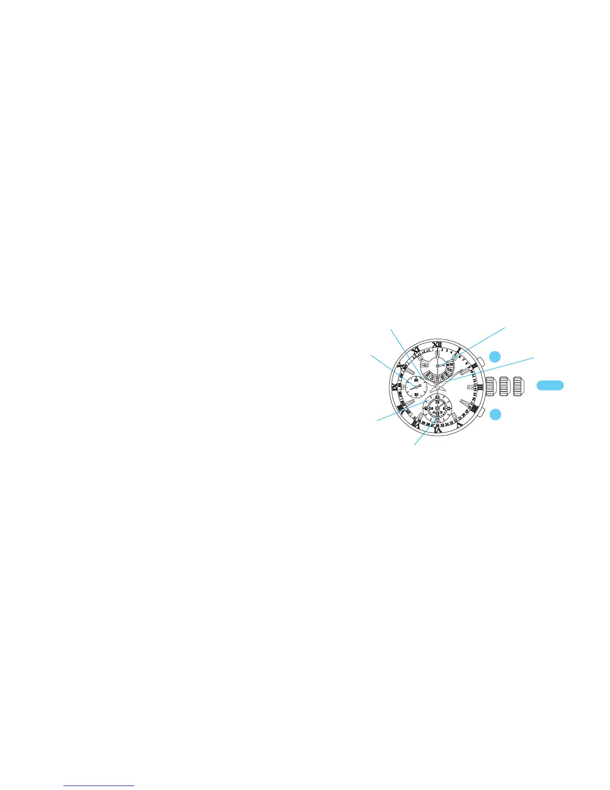 • Day of the week is indicated by the day hand at the 12 o’clock position.
