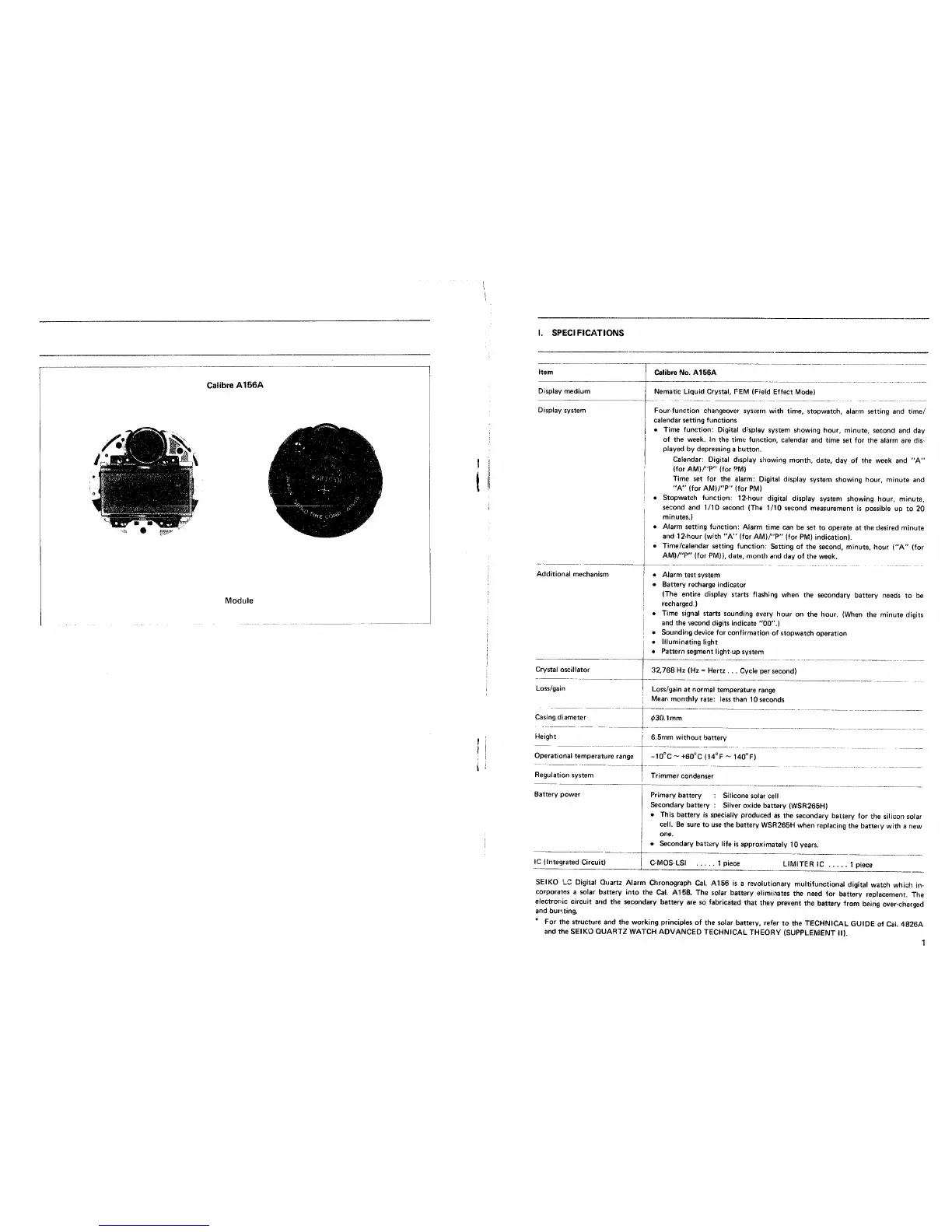 Seiko A156A - Seiko Cal. A156 A Technical Specifications; Display and Functionality Details; Power and Component Information