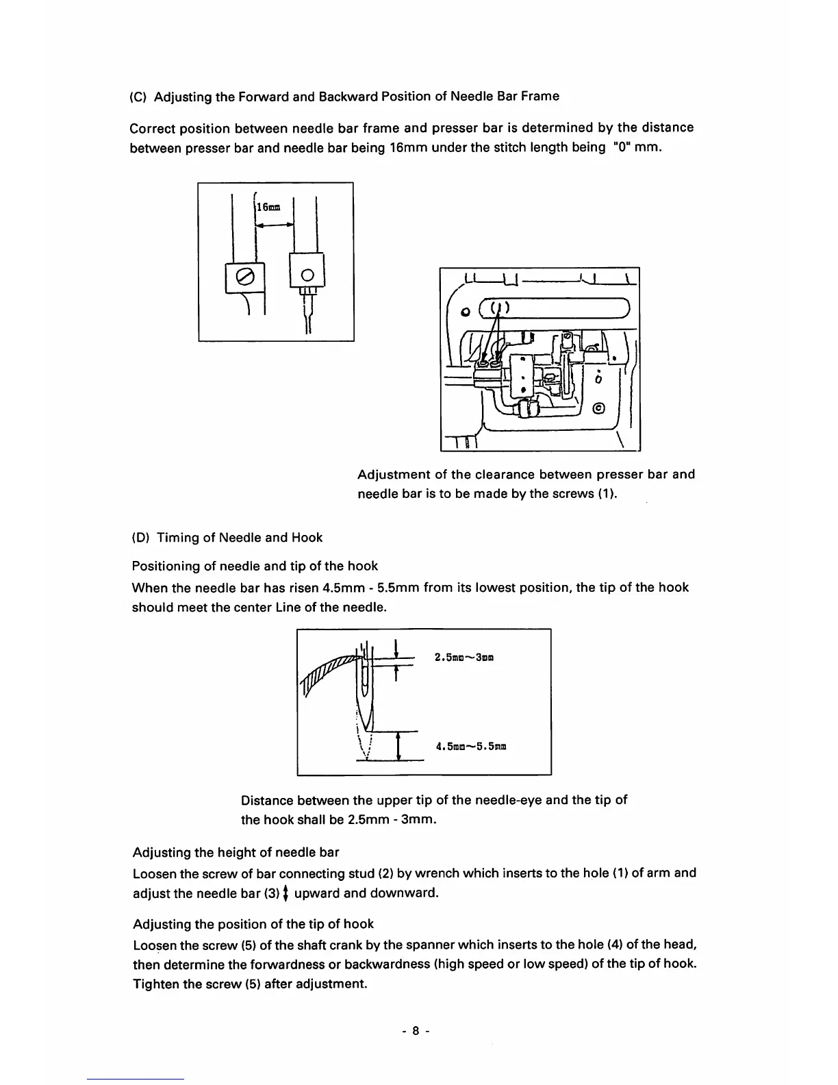 Seiko CH-2B - (D) Timing of Needle and Hook; Positioning of Needle and Tip of the Hook; Adjusting the Height of Needle Bar; Adjusting the Position of the Tip of Hook