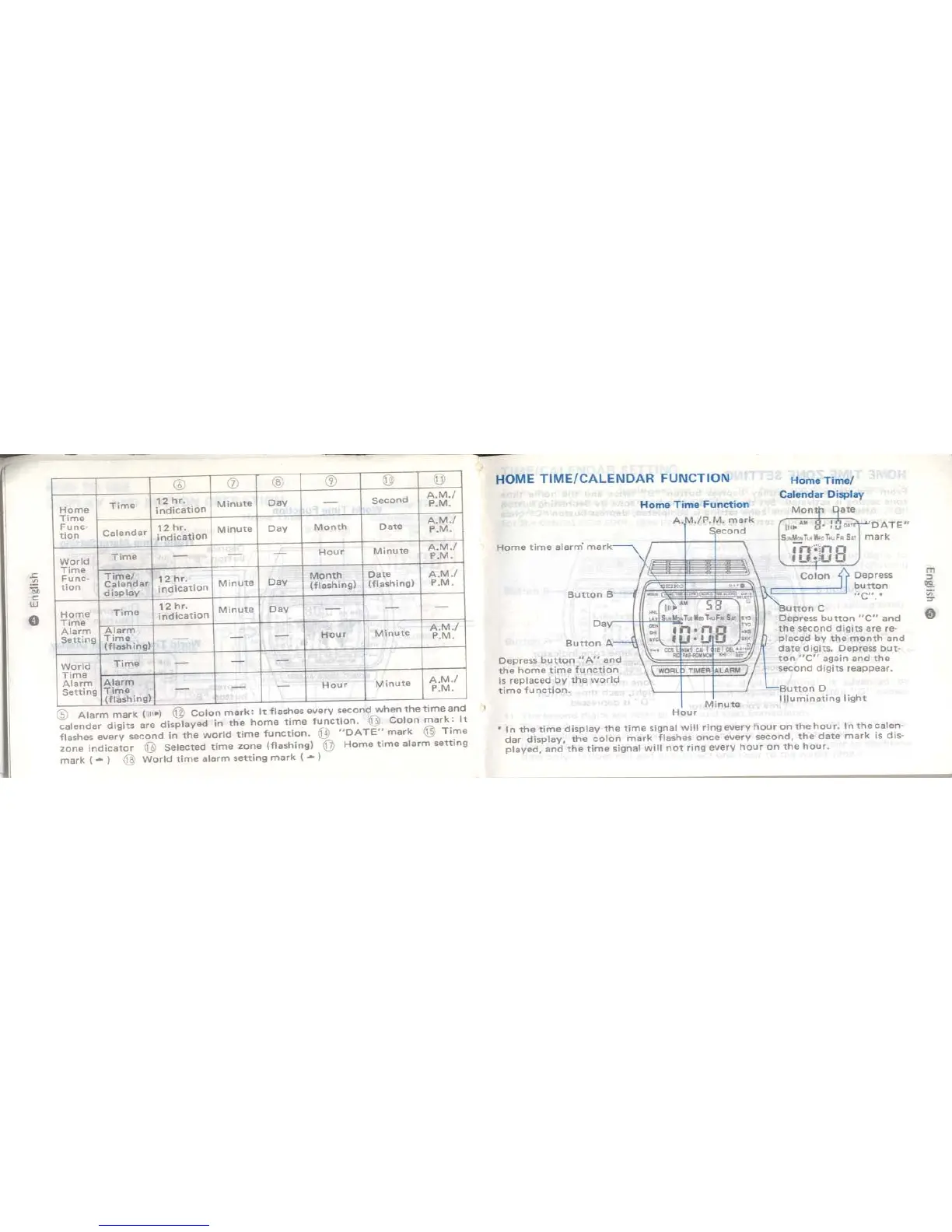 Seiko Quartz A239 - Home Time and Calendar Functions; Display Elements and Indicators; Light and Hourly Signal Features