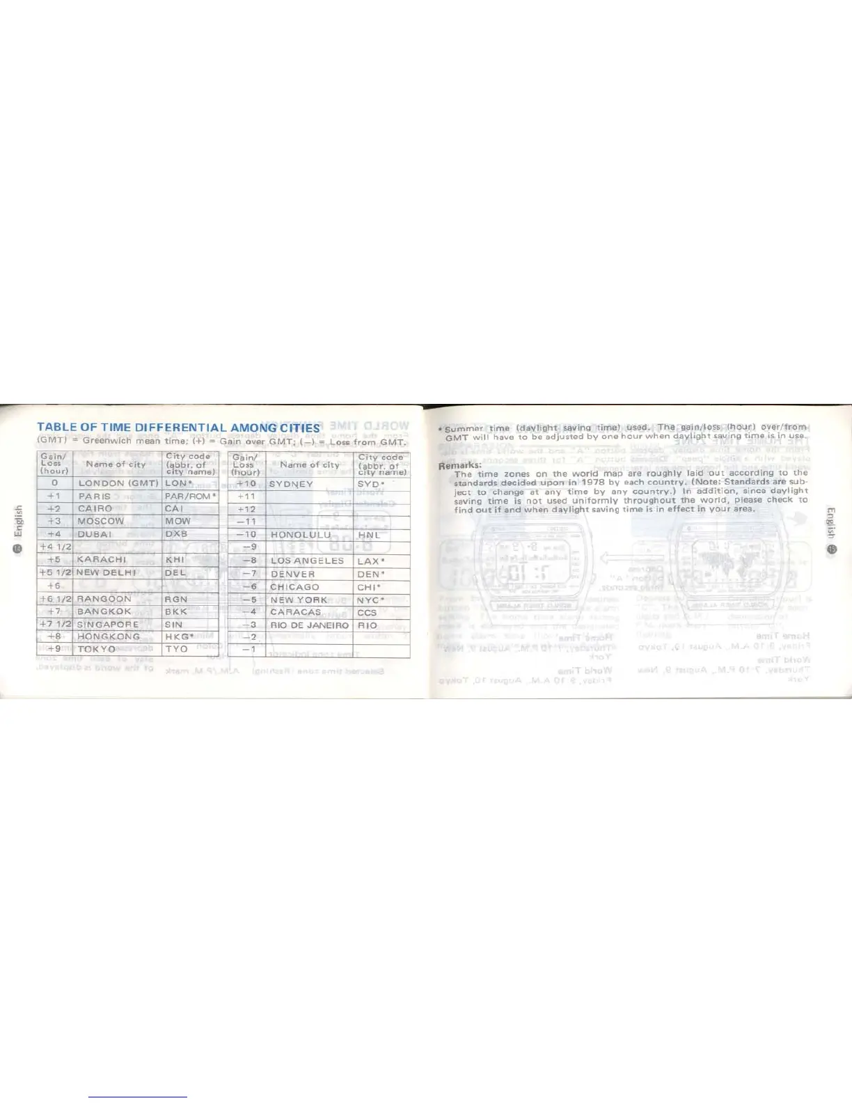 Seiko Quartz A239 - International Time Zone Reference; City Time Difference Table; Daylight Saving and Zone Notes