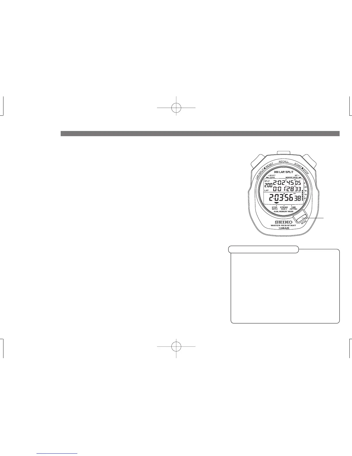 Single memory mode ..... Up to 300 lap/split time data can be stored and recalled either